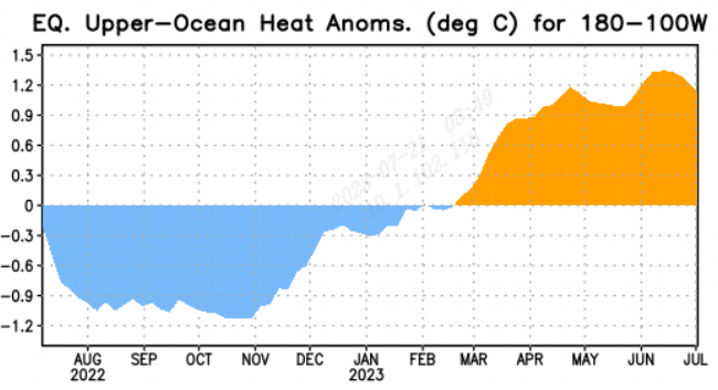 据NOAA最新预测数据显示厄尔尼诺形成概率:8~11月厄尔尼诺的概率目前已经上升至95%以上了,且到12月份以后才能回落。而从目前的ENSO指数来看,2023年3月上旬太平洋海温异常指数升至0.5℃附近,目前已经持续至7月,最高在6月中旬曾达到1.3℃附近,如果这样的异常海温持续五个月至8月,则宣告厄尔尼诺正式形成。