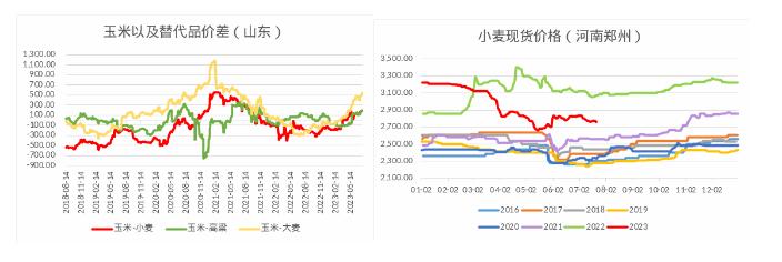 今年新麦大量上市后,玉米受到芽麦替代玉米的压力很大。但近段时间,由于局部地区的芽麦毒素指标普遍偏高,饲料加工企业收购使用量也相对有限,同时在使用芽麦生产的饲料进行实际饲喂的过程中,饲料发酸影响外销、生猪采食量下降等问题逐渐被发现,这在一定程度上影响了猪饲料生产中芽麦的使用比例,部分饲料加工企业已下调芽麦使用比例或停用芽麦进行生产。芽麦使用比例减少对于玉米市场来说是个利好消息。不过,当前山东地区二等玉米和小麦的价差在160~180元/吨附近,在新季玉米收割上市前,小麦在饲料中的替代依然有质量和价格的优势,若后期价差维稳则不会对玉米价格有太大压力,但若价差扩大,则小麦替代有望增加。