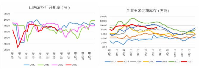 7月玉米淀粉价格走势较为平稳,近期淀粉深加工厂家玉米原料供应压力稍有缓解,不过玉米原料下跌一定程度上也带动淀粉价格下行。截止七月末国内淀粉库存为90.8万吨,虽然同比略有下滑,但仍处于近七年的偏高位置。目前山东淀粉现货报价在3400元/吨左右,部分企业为锁定部分订单议价成交,因此成交价明稳暗降。不过仍有厂家在坚挺报价,山东淀粉厂开机率持续下滑,三季度有望维持低位。未来市场虽有看空情绪,但玉米价格后市走稳,淀粉有望跟随。