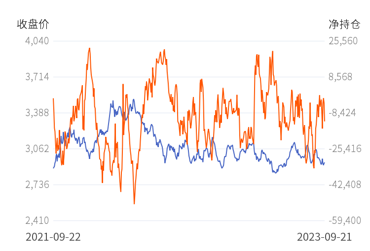 据统计,近两年价格和净持仓数据的相关系数为-0.47,两者存在低度负相关关系(反向性)。
