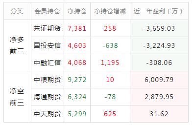 从净多头持仓排行来看,东证期货以7381手净多排行榜首,日内净多头头寸增加258手,该公司品种主力合约近一年盈利为-3,659.03万元。