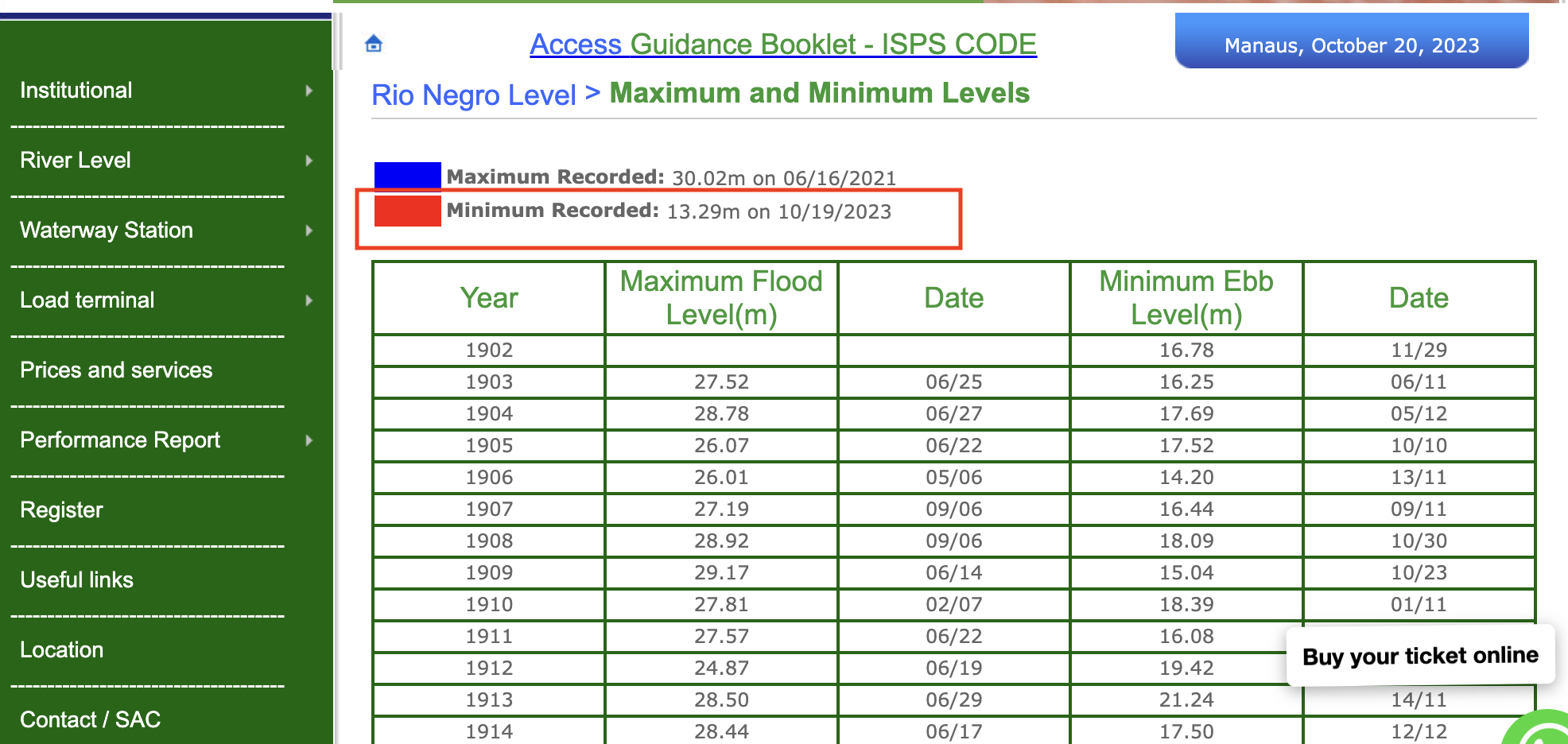 10月19日的水位降至13.29米,继续刷低历史记录。图源:马瑙斯港口官网