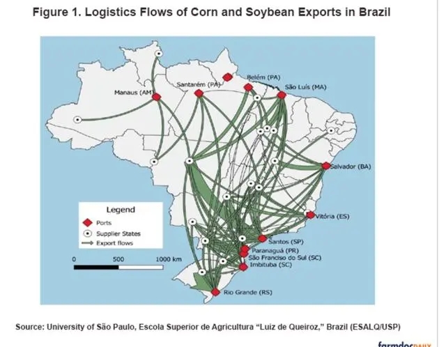 巴西大豆和玉米出口传统上依赖南部和东南部港口,主要通过长途卡车在主产区和南部港口间进行货物运输。但是在过去十年,巴西又开拓了亚马孙地区所在的北部出口路线,它主要通过亚马孙河流的水路将谷物运往马瑙斯等主要港口,这进一步增强了这个南美谷物出口大国的竞争力。