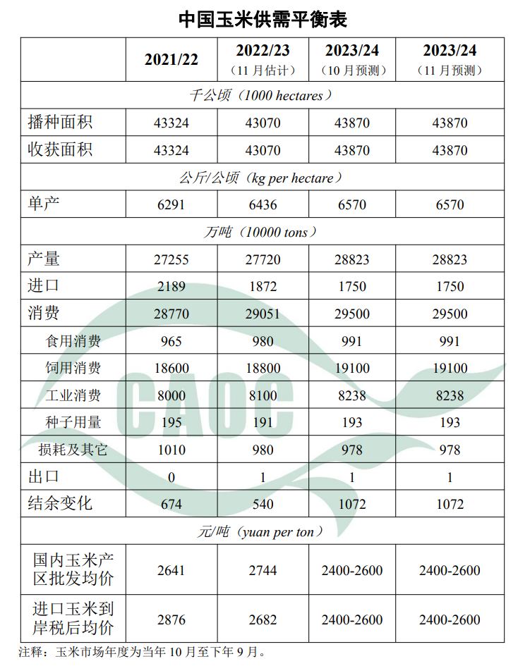 本月对2023/24年度中国玉米供需形势预测与上月保持一致。10月份以来,秋粮主产区尤其东北地区天气晴好,有利于玉米成熟收获,品质总体较好,但气温偏高不利于潮粮存储,农户售粮意愿较高,玉米价格持续下行。进入11月以来,冷空气势力较前期增强,农户存粮惜售看涨心理逐渐加重,加之中储粮各地直属库入市收购,玉米价格止跌回升。气象部门预计后期东北降水偏多,对秋粮运输、存储有一定不利影响,建议农户根据粮食质量、储存条件和自身经济状况把握售粮时机。