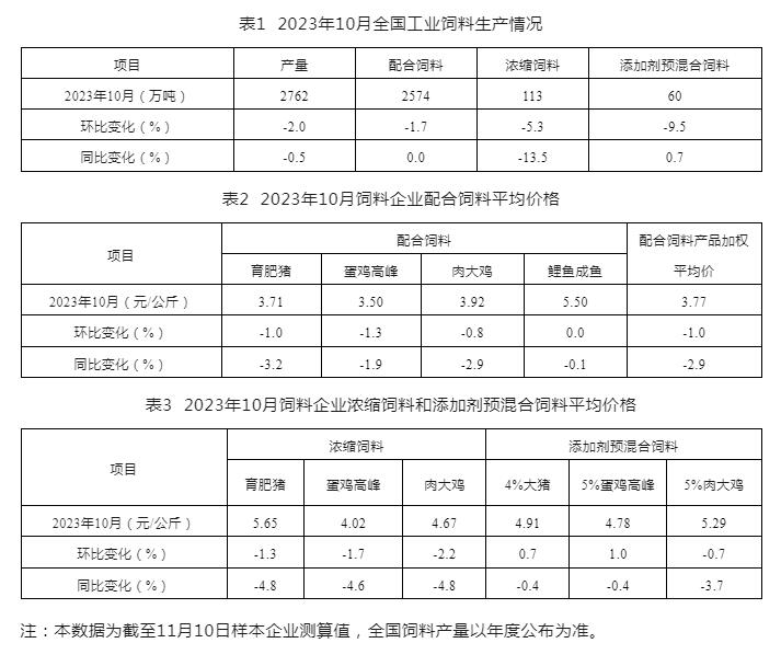 据样本企业数据测算,2023年10月,全国工业饲料产量2762万吨,环比下降2.0%,同比下降0.5%。主要配合饲料、浓缩饲料产品出厂价格环比、同比均呈下降趋势,添加剂预混合饲料产品出厂价格同比小幅下降。饲料企业生产的配合饲料中玉米用量占比为30.0%,配合饲料和浓缩饲料中豆粕用量占比13.8%,同比分别下降4.0和1.1个百分点。