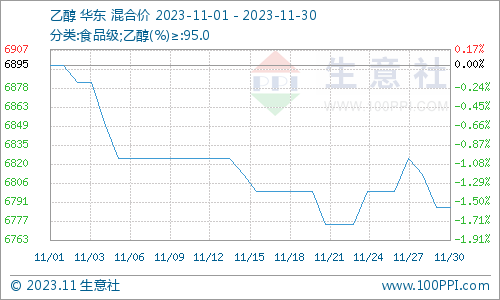 据商品行情分析系统,11月国内乙醇市场行情偏弱运行。11月1日至30日,国内乙醇生产商均价自6895元/吨下跌至6787元/吨,周期内价格跌幅1.56%,价格同比上涨1.31%。