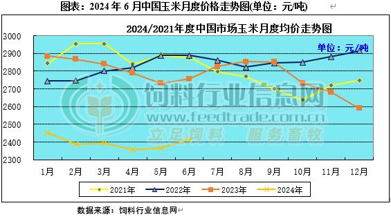 2024年6月主产区剩余粮源见底,政策粮投放持续,贸易商看涨后市,惜售情绪高涨,市场玉米有效供应收紧,支撑价格上涨,不过新麦已具备替代性价比,进口谷物供应仍偏宽松,需求企业对玉米的采购增量有限,市场仍承受一定压力,全国现货均价月环比上涨2.35%。