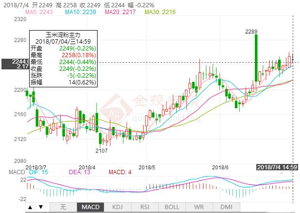 6月11日以来,我国连盘玉米淀粉期货走势进入上升第五浪,7月4日淀粉主力合约1809小幅冲高后回落,波动区间2244-2258元/吨,最终报收于2249元/吨,涨0元/吨,涨幅0%,持仓量197718手,减仓18072手。 淀粉1809合约成交减量走平,继续关注阻力位2250元/吨,下一个目标位2350元/吨。