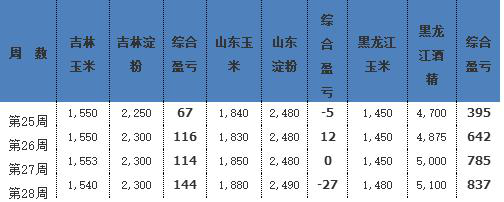 第28周,玉米原料成本小幅震荡但上升为主,吉林企业每生产一吨玉米淀粉理论盈利144元/吨,山东企业每生产一吨玉米淀粉约亏损27元/吨;国内玉米酒精价格继续上涨,黑龙江西部每生产一吨玉米酒精理论盈利约837元/吨,进一步突破今年利润新高。