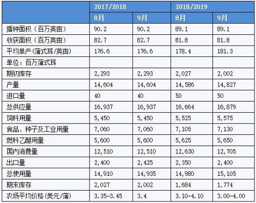 美国2018/19年度新玉米上市在即,9月12日,玉米供需报告中,美国2018/19年度玉米种植面积预估为8910万英亩(上月8910,去年9020),玉米单产预估181.3蒲式耳(上月178.4,去年176.6),总产量预估148.27亿蒲式耳(上月145.86,去年146.04),年末库存预估17.74亿蒲式耳(上月16.84,去年20.02)。美国玉米播种面积、收获面积未变,玉米亩产预测大幅上调至创纪录的178.4蒲,是两年来的最高水平,高于上月,高于分析师预测的143.51亿到146.07亿蒲式耳,玉米产量也远高于分析师平均预期的143.96亿蒲,产量和供应量均创纪录。供应数据的大幅调高,令市场震惊,当日(9月12日)芝加哥期货交易所(CBOT)玉米期货12月合约收盘下跌3.6%,收至352.5美分/蒲式耳,创下自4月份以来的最大单日跌幅。