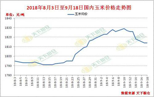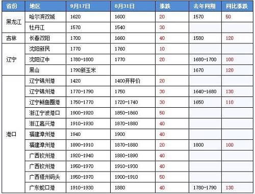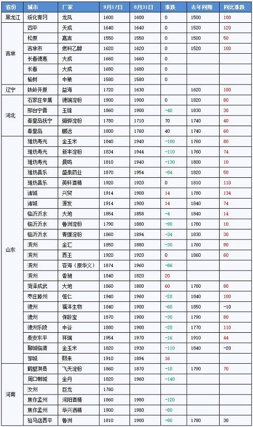 不过,9月份,华北地区玉米价格滞涨回调,开启跌势。截止9月17日,山东地区深加工企业玉米收购主流区间价在1820-1920元/吨,较8月底跌20-130元/吨不等。