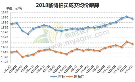 临储玉米拍卖截至上周已进行23周,各地新粮陆续上市对市场各界心态有所压制,持续攀升的成交量也有所回调,上周成交393万吨,低于前一周的429万吨,成交均价也低于前一周(见图一)。9月14日当周,临储玉米投放795万吨,成交393万吨,成交率49.4%。截至上周2018年临储玉米总计投放1.80亿吨,总成交7920万吨,总成交率44%,目前东北市场至少约有2500万吨左右尚待出库,供应仍足。按往年惯例10月底临储拍卖将结束,新季玉米也开始集中上市,再加上尚未出库的以及剩余的陈粮库存,庞大的供应压力或将限制玉米价格上涨空间。