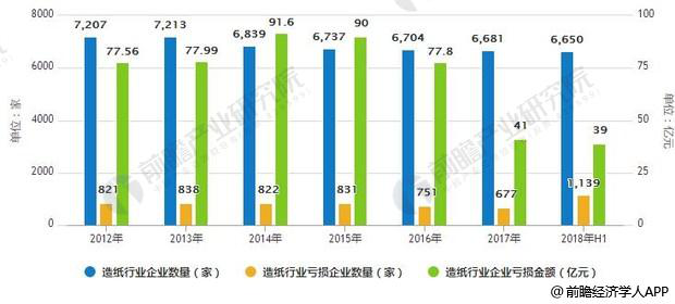 2012-2018年H1中国造纸行业企业数量及亏损统计情况
