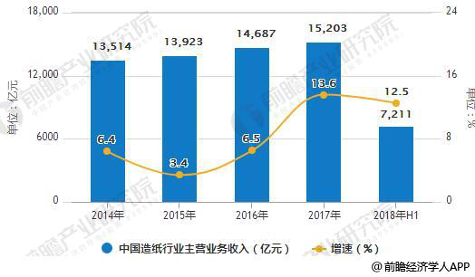 据前瞻产业研究院发布的《造纸行业发展前景与投资战略规划分析报告》统计数据显示,2018年上半年我国造纸行业规模以上企业实现主营业务收入7211亿元,同比增长12.5%,达到2017全年主营收入的47.43%。回顾2014-2017年造纸行业营业收入情况:近四年来,我国造纸行业营业收入保持稳步上涨。