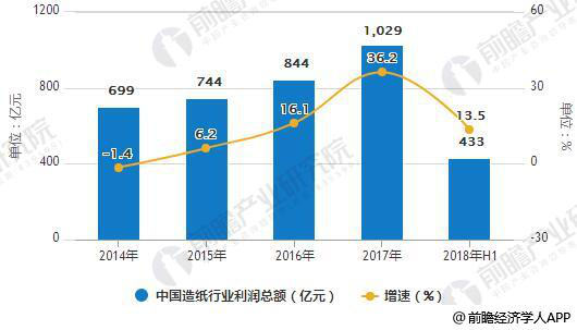 近年来,我国造纸行业利润总额与营业收入同步,保持稳定上涨。2017年全年造纸行业实现利润总额达到1029亿元,同比增长36.2%。到2018上半年全国造纸行业利润总额达433亿元,相比去年同期造纸13.5%。