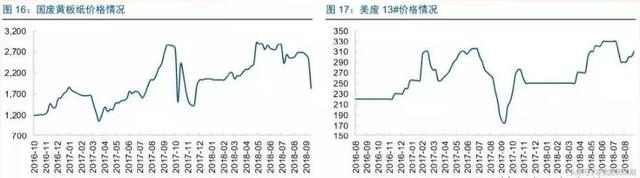 原材料端:按照库存和运输周期调整环比的时间窗口(国废1个月,美废2个月),国废黄板纸均价为2693元/吨,环比上涨12.69%,美废13#均价为308美元/吨,环比上涨22.49%。