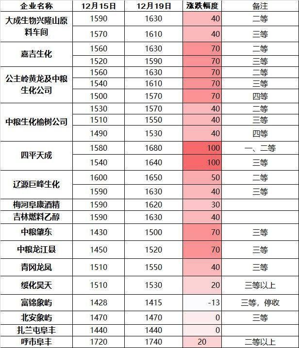 12月8日-16日的一周,我国东北多家深加工企业在11月底至12月初的玉米持续涨势中突然主动下调挂牌价格,累计降幅约40元/吨,然而由于玉米收购量随价格同步明显减少,12月17日起东北深加工企业再度恢复提价,近三日累计涨幅20-100元/吨,吉林深加工企业三等玉米挂牌价区间1550-1640元/吨,黑龙江深加工企业三等玉米价格1470-1550元/吨。与之相反山东深加工企业挂牌价下跌10元/吨,山东英轩酒精企业玉米挂牌价1780元/吨。