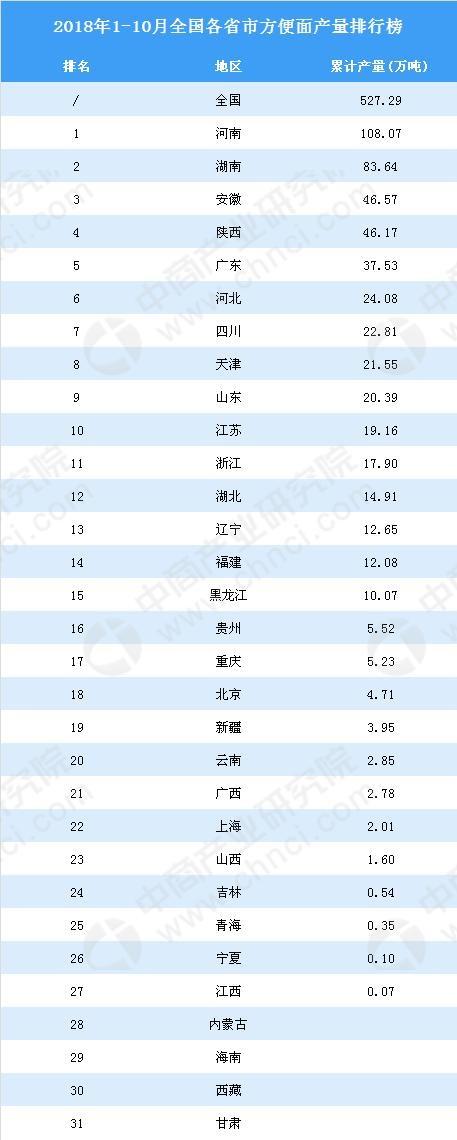 2018年1-10月全国各省市方便面产量排行榜