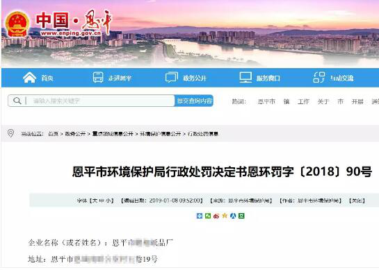 1月8日,广东省恩平市环境保护局公示了对恩平市鹏X纸品厂的行政处罚决定书。该纸品厂因为发生水污染事故后未及时启动应急方案,被恩平市环保局处罚款10万元。