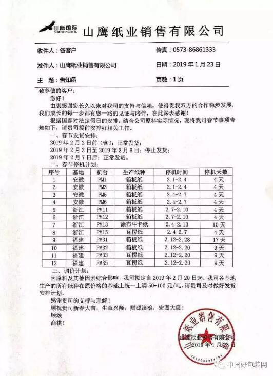 近日,山鹰纸业发布了2019年春节发货安排的公函:根据国家法定节假日安排及公司原料实际情况,2月3日-2月6日停止发货,2月7日正常发货。