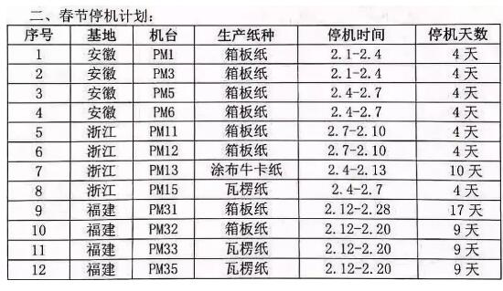 不过,与其不同的是,此次山鹰纸业还发布了停机计划,安徽、浙江、福建三大基地共计12台箱板纸、涂布牛卡纸、瓦楞纸纸机检修4-17天不等。