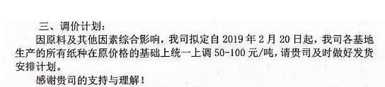 当然,最引人关注的是,在本次通知中,山鹰纸业还宣布,自2月20日起,各基地的所有纸种统一上调50-100元/吨。