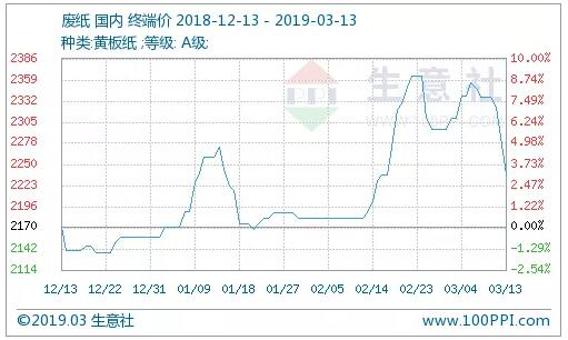 通过观测市场变化来看,本周开始废纸价格依旧延续着上周末废纸的下调趋势,12日随着玖龙几大基地下调了废纸价格,引发全国纸厂跟进下调。13日、14日废纸价格愈演愈烈全国各地纸厂废纸价格迎来全面下调。近日国内废黄板纸均价价格为2237.14元/吨,价格下调幅度在30-130元/吨之间。