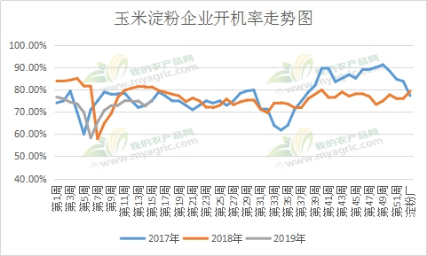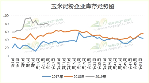 走货及库存情况,目前玉米淀粉企业库存量依旧维持高位,但由于前期低价位合同签订情况较好,且玉米价格上行下游心态有所改善。从库存走势图来看,近期库存并未再攀升,且呈小幅下降态势。根据我的农产品网对全国66家主要玉米淀粉厂家的最新调查数据显示,2019年第16周,截止4月17日玉米淀粉企业淀粉库存总量78.8万吨,较上一周减少2.8万吨。下调区域主要集中为黑龙江、内蒙、山西等地区。
