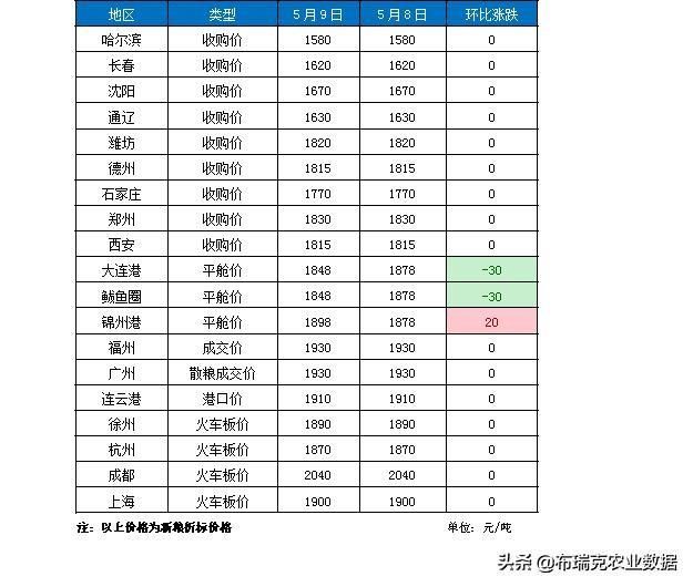 南北港口玉米价格稳定,锦州主流报价1840元/吨-1855元/吨,理论平舱1890-1905元/吨,较昨日持平;容重720以上玉米价格相对平稳,主流报价1860元/吨-1880元/吨,理论平舱1910-1930元/吨;鲅鱼圈主流报价1830元/吨-1835元/吨,理论平舱1880-1885元/吨,广东散船主流报价1960元/吨-1990元/吨,较昨日小涨10元/吨;东北深加工企业收购价格稳定,黑龙江收购1620-1720元/吨,吉林1680-1760元/吨,华北深加工企业玉米挂牌价格个别涨价1870-2010元/吨,南通港口码头报价1960元/吨。