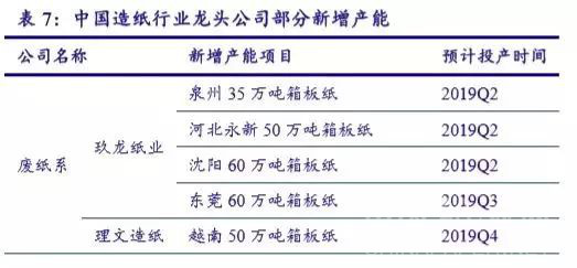 从产能方面的数据来看,包装用纸行业产能前四的公司分别是玖龙纸业、理文造纸、博汇纸业和山鹰纸业。其中,玖龙纸业、理文造纸在港股上市,是目前国内造纸行业规模最大的两家公司;博汇纸业和山鹰纸业在A股上市。玖龙纸业目前有约1335万吨包装用纸产能,公司在广东东莞、重庆、天津等地均有设厂,产能在全国范围内布局十分广泛,牢牢占据包装用纸行业的龙头地位。而位居第二的理文造纸,也有将近700万吨包装用纸产能。根据2018年各公司的产能数据测算,包装用纸行业的CR4仅为30.23%,CR8也仅为38.92%,行业集中度较低。