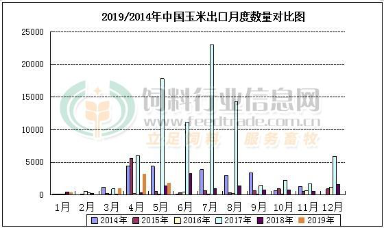 2014-2019年中国玉米出口数量统计图