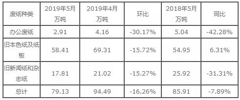 2019年5月份我国废纸进口总量同环比下降。据海关统计,5月份我国共进口废纸79.13万吨,同比下滑7.89%,环比下滑16.26%;1-5月份累计进口数量444万吨,同比下滑25.7%。