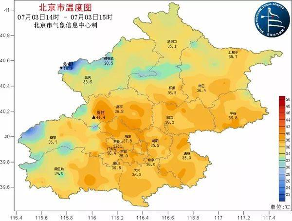 7月3日,北京地区迎来今年七月份的首个高温日。监测显示,截至当天下午3点,城区气温普遍在36到39℃之间,古观象台、大观园、回龙观等地气温超过40℃,气温最高的站点出现在昌平区流村,达到41.4℃。
