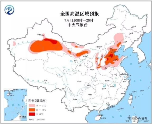 中央气象台今天(4日)早上6点继续发布高温黄色预警。预计今天白天,北京、天津、河北中南部和东部、辽宁西南部、山西中南部、陕西东部、山东、河南中北部、内蒙古西部、甘肃西部、新疆东部和南疆盆地等地最高气温达35~37℃。