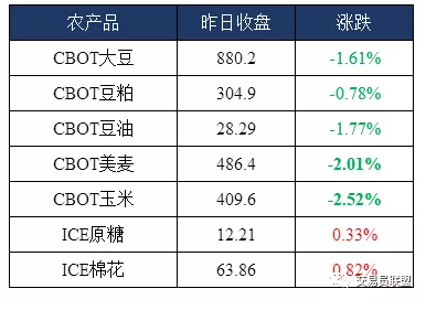 当天,芝加哥期货交易所玉米市场交投最活跃的12月合约收于每蒲式耳4.1美元,比前一交易日下跌11美分,跌幅为2.61%;小麦9月合约收于每蒲式耳4.8725美元,比前一交易日下跌10美分,跌幅为2.01%;大豆11月合约收于每蒲式耳8.815美元,比前一交易日下跌15.25美分,跌幅为1.7%。