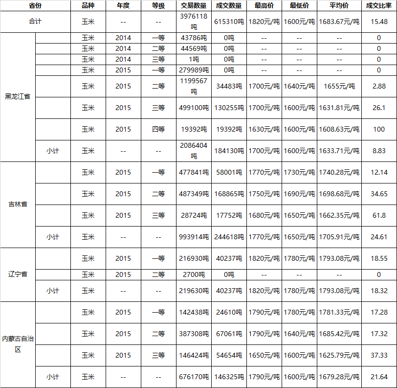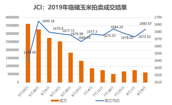 8月8日,临储玉米投放3976118吨,成交615310吨,最高成交1820元/吨,最低成交1600元/吨,成交均价1683.67元/吨,成交率15.48%,累计投放4767.7306万吨,成交1955.2218万吨,累计成交率41.01%。