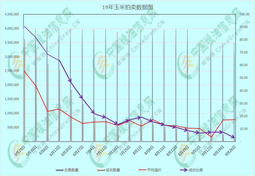 行情砸穿底价,抹杀翘尾可能。由于华北、西北等其他非东北产区的新季玉米开始上市,使得这些地区的用粮企业开始摆脱拍卖陈粮,拍卖底价的托底作用失效,价格行情直接砸穿拍卖底价。以辽宁15年一等玉米为例,底价1780元/吨,底价成交加上出库贴水都要近1900元/吨,比19年早熟玉米还贵,这个价格人家都上船了,所以陈粮谁拍谁坐地就开始赔钱,只有靠近西北地区的几个标地,由于西北上市被降雨延误,可用的优质干粮稀缺,在很短的时间内还有成交价值,使得成交均价抬升了。拍卖成交率屡次刷新历史新低,想要翘尾基本是没机会了。